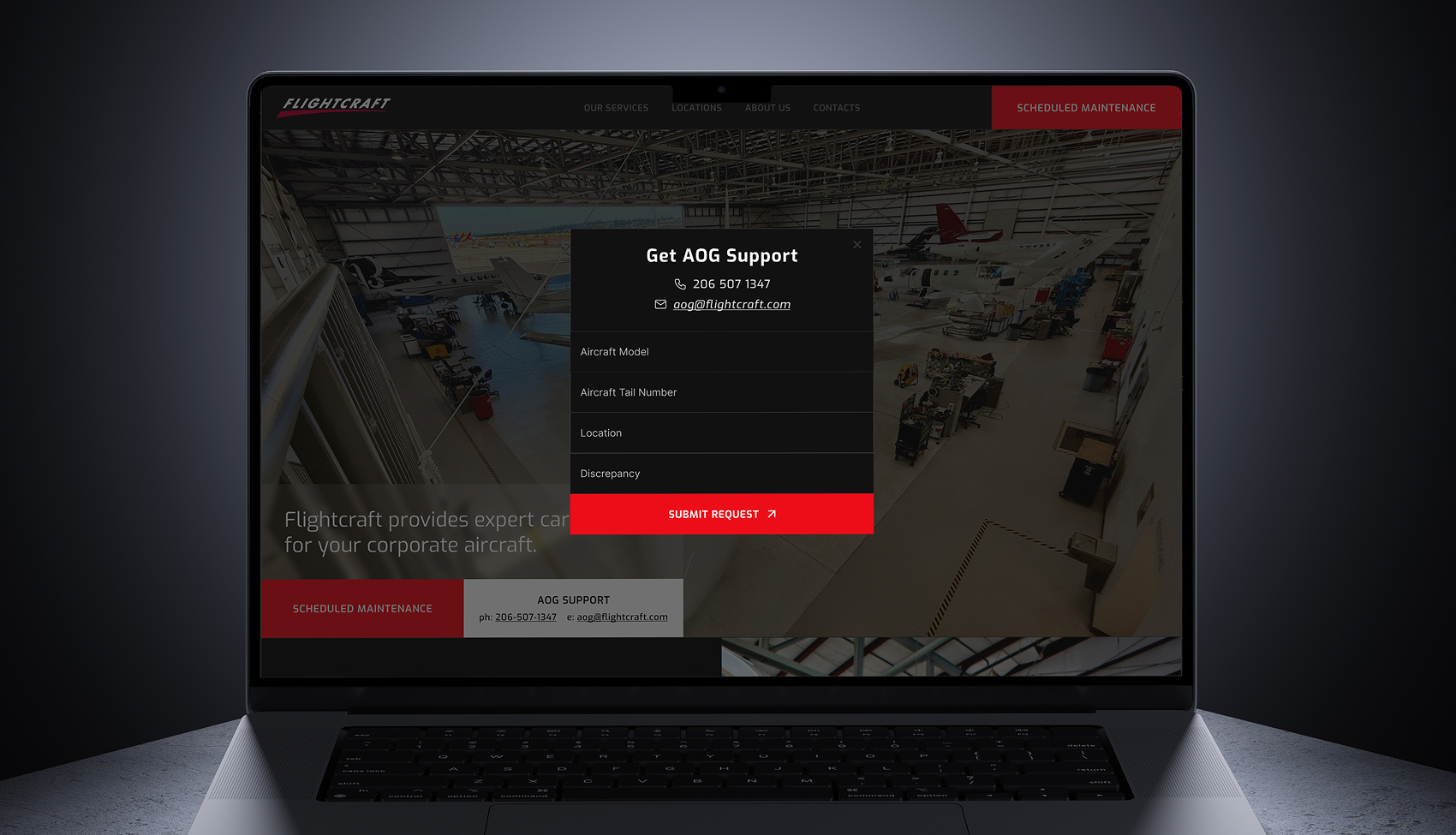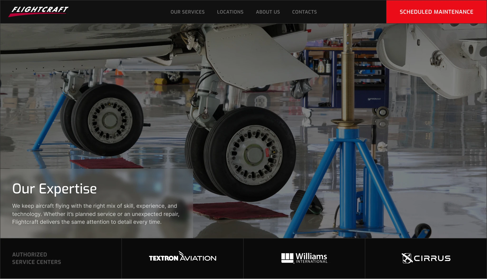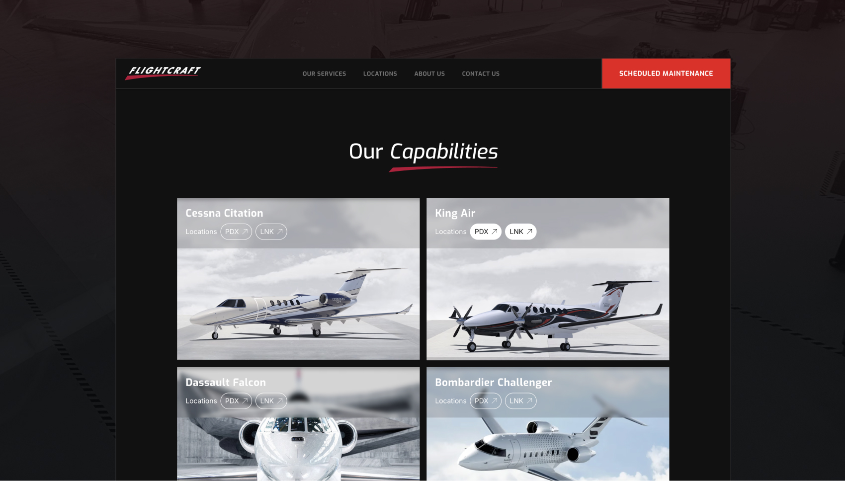 The previous Flightcraft website lacked a clear structure and did not properly highlight the full scope of maintenance and repair services provided across PDX and LNK. Critical information such as AOG (Aircraft on Ground) emergency support was difficult to find, and the site was not optimized for tablet use – a crucial need for pilots and technicians on the go.