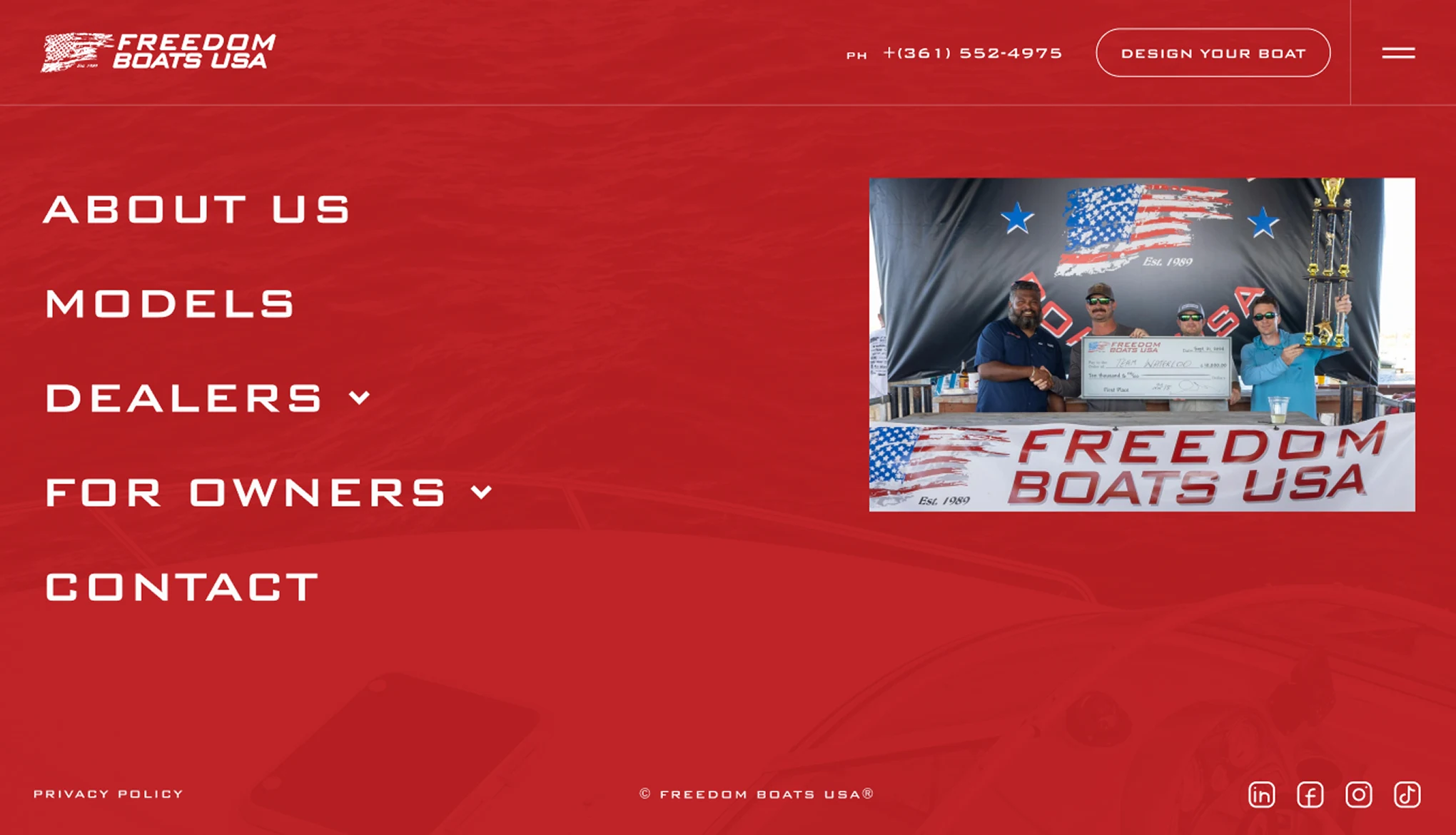 Freedom Boats is a professional boat manufacturer known for their beautifully crafted vessels built with 100% composite materials, making them rot-resistant and exceptionally durable. Their reputation for quality and innovation set the stage for a website that matched the same level of craftsmanship as their boats.